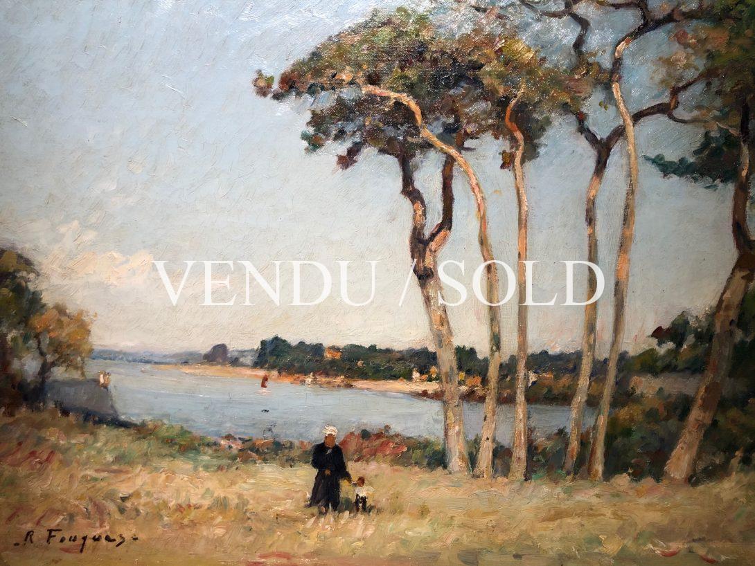 Ce joli tableau, d’une facture postimpressionniste, nous emmène sur la côte d’Emeraude en Bretagne, du côté du charmant village de Saint-Lunaire, où l’on semble reconnaître la pointe du Nick. Une jolie chaumière se distingue, entourée d’arbres aux allures de parasols, une bretonne vient joliment égayer la scène avec son enfant. Des éclats de rouge au loin suggèrent la présence de voiliers en route vers le large. Dans cette œuvre, le peintre Fouques réunit là toute la tendresse de la Bretagne.