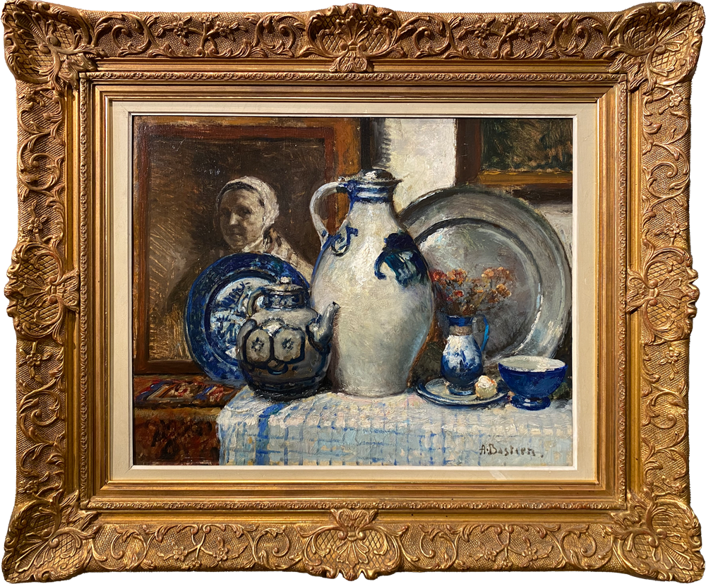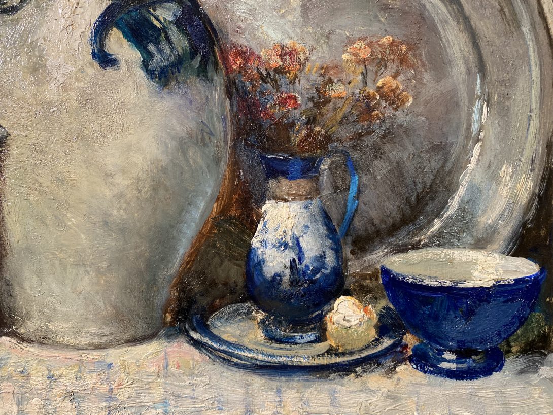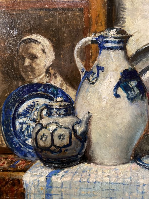 Notre nature morte, aux tons sourds et contrastés que le peintre éclaire d’un luminisme discret, est caressé d’une lumière blonde qui idéalise le décor dans lequel sont placés des tableaux et des pots de cuisine. Ces tons lumineux échafaudent la composition en éclairant uniquement les points forts, à la pâte enlevée. La structure est solide, les matières surgissent de manière spontanée à travers de forts empattements dans la couleur bleue des pots et des tasses. Des tons forts, une palette emportée et une touche pourtant minutieuse soutiennent cette œuvre très originale, où l’émotion du peintre semble être restituée à chaud devant ces objets du quotidien, mais magnifiquement agencés dans un intérieur à la riche décoration.
