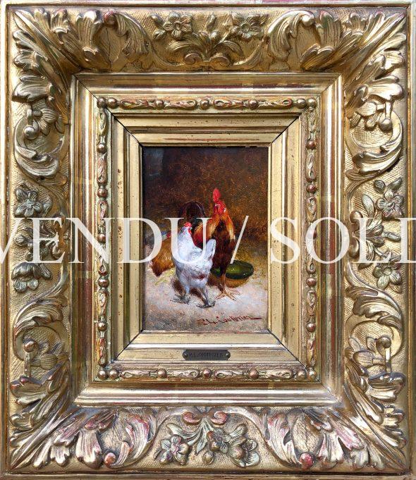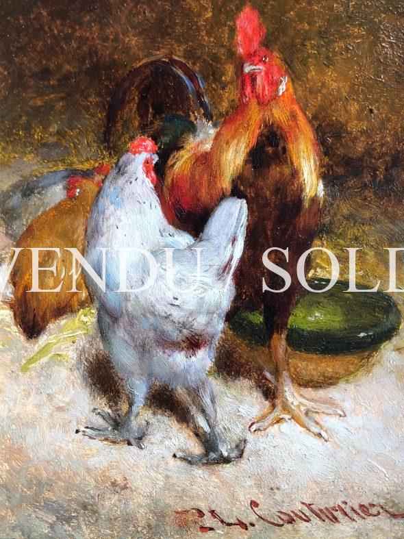 Philibert Léon Couturier, born in 1823 in Chalon-sur-Saône, Bourgundy and died in 1901 in Saint-Quentin, was a well-established artist specializing in animals and portraits. Student of Charles Couturier and Picot at the Beaux-Arts school in Paris since 1844, the artist exhibited at the Paris Salon between 1845 and 1867, winning a third class medal in 1855 at the Exposition Universelle and another reward in 1861. Couturier had also great ties with the Barbizon school through his friend Théophile Gautier, another successful pastoral artist, and became renowned for his artistic ability to paint chicken and roosters in farmyard scènes, which he painted with a great vivacity of coloration.