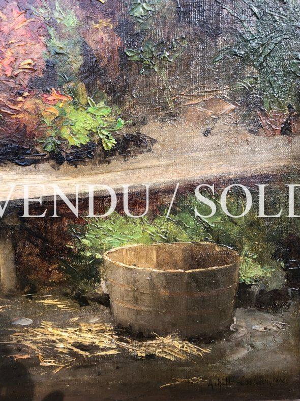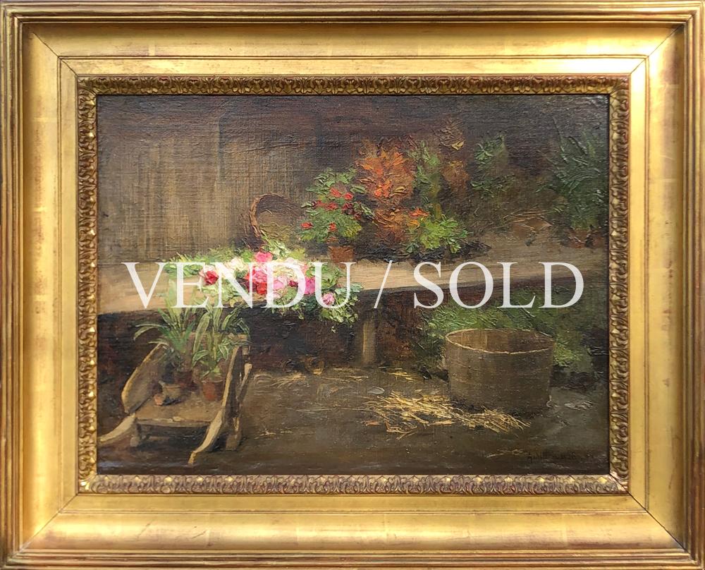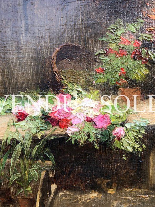Dans notre délicieux tableau, quelques roses fraîchement coupées viennent embellir l’établi du jardinier. À sa portée de sécateur, une brouettée de plantes en pots joliment peinte, où suit la contemplation de ce que le monde champêtre comporte de plus fragile, quelques fleurs. Au charme provincial, notre composition démontre la sincérité de l’artiste et la beauté de l’instant. Baigné d’une tendre lumière posée sur le bouquet, l’atelier du peintre-jardinier est couché de couleurs aux valeurs sombres et ombrageuses, accentuant le lumineux contraste du bouquet en devenir, qui ne se résume encore qu’à quelques notes de couleurs vives. Brossées d’une touche un peu insistante et relevées d’empâtements, ces quelques roses posées montrent ici l’excellente maîtrise du métier de Cesbron.
