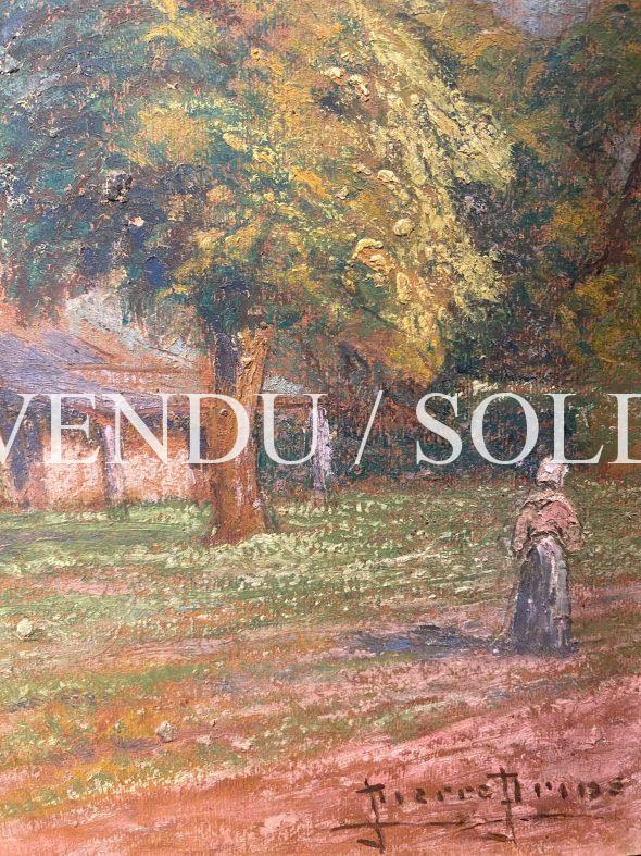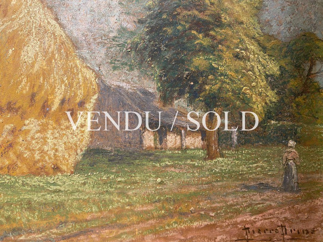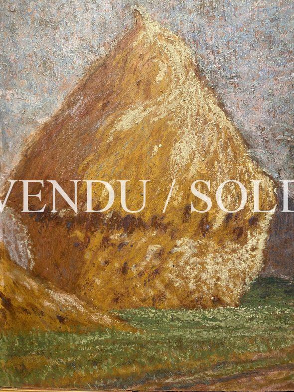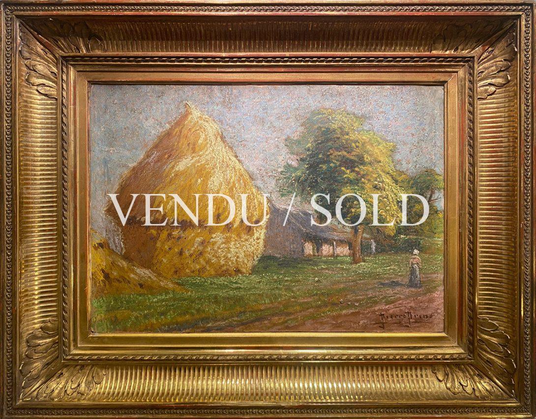 La Meule de paille, Pierre PRINS (Paris, 1838-1913)Huile sur carton, signée en bas à droiteÉtiquette d’exposition au dos Dimensions sans cadre 46×32 cmDimensions avec cadre 66×53 cmPierre Prins est l’aîné d’une famille de fabricants et marchands de parapluies , ombrelles et cannes. Orphelin de son père, il se passionne pour la sculpture et s’inscrit sur les conseils de sa mère dans une école d’arts décoratifs en 1861.Il fait la connaissance d’Edouard Manet par l’intermédiaire de sa sœur Pauline, amie très proche de Suzanne Leenhoff, et se lié d’amitié avec Zachary Astruc qui l’entraîne au café Guerbois pour fêter les premiers succès de Manet.Parmi ses amis, on compte aussi Stéphane Mallarmé et Alfred Sisley, avec lequel il partage le goût de la campagne et de la paysannerie, Manet restant le plus proche mais aussi leurs femmes respectives, toutes deux musiciennes.En 1869, il épouse Fanny Claus avec Manet comme témoin et au Salon de 1869, Manet présente sa toile Le balcon pour laquelle a posé Fanny Claus, debout avec son ombrelle, aux côtés de Berthe Morisot assise.En 1874, Pierre Prins participe à la création de la Société anonyme des artistes peintres, sculpteurs et graveurs et décide d’emmener son épouse à Namur pour se reposer. Mais avant de partir, il confie douze tableaux à son ami d’enfance le sculpteur Émile Scailliet, afin qu’il remette les toiles à Alfred Sisley, qui doit les déposer à l’atelier que le groupe loue à Nadar pour leur première exposition en avril 1874 , dans les anciens ateliers du photographe à Paris. Scailliet ayant oublié de remplir sa mission, Pierre Prins n’exposera jamais avec les peintres impressionnistes.Rongé par le chagrin d’avoir perdu Fanny en 1877, il ne travaille plus, et ce n’est qu’avec le soutien de son ami Manet qu’il reprend peu à peu goût à la vie, reprenant ses pinceaux et ses pastels. En 1878, il replante son chevalet dans les prés et les vergers et effectue des voyages en Bretagne à Pont-Aven, Le Pouldu, en Normandie , en Aquitaine, en Angleterre et en Belgique, tout en gardant une prédilection pour les paysages d’Île-de-France.Edouard Manet meurt en 1883, Pierre Prins dessine plusieurs portraits de son ami sur son lit mortuaire. Stéphane Mallarmé meurt en 1898, Prins dessine au pastel la maison de son ami.Vers la fin de sa vie, l’artiste peint dans les environs de Rambouillet, à Grosrouvre où sont installés de nombreux artistes et prononce un discours lors de l’inauguration par le président de la République Émile Loubet en 1905 d’une exposition sur l’Ecole de Rambouillet. Prins avait bien compris la nécessité d’être remarqué par les marchands. Il expose à de nombreuses reprises chez des galeristes en France et en Europe. En 1907, Georges Petit, le concurrent de Durand-Ruel, lui consacre une nouvelle exposition en accrochant une centaine de ses œuvres. Les critiques débordèrent d’enthousiasme et reconnurent en Prins un artiste talentueux. Ses œuvres sont exposées dans de nombreuses collections publiques:Auvers-sur-Oise, musée d’AubignyFécamp, musée des Terre-Neuvas et de la pêche ( Les foins près d’Orsay en Septembre, pastel )Gaillac, musée des Beaux-Arts Gray, musée Baron-Martin ( Les Meules et l’arbre, pastel )Paris, musée Carnavalet ( Le cabaret du Lapin Agile sous la neige à Montmartre ) Paris, musée d’Orsay Notre charmant tableau de meule de paille est à rapprocher de sa célèbre série de tableaux peints au soleil de Sucy-en-Brie en 1904 et exposé lors d’une magnifique rétrospective au Musée Fournaise sur le peintre en 1999, consacrant ses cimaises à l’art de cet extraordinaire pastelliste et lui rendant sa place légitime parmi le groupe des impressionnistes de la première heure.Anne Galloyer, critique d’art et chargée de recherches sur l’œuvre du peintre a écrit : « Prins rêve en homme heureux et quand il peint, ce n’est ni du Manet, ni du Monet, ni du Sisley. C’est du Prins et c’est signé. »