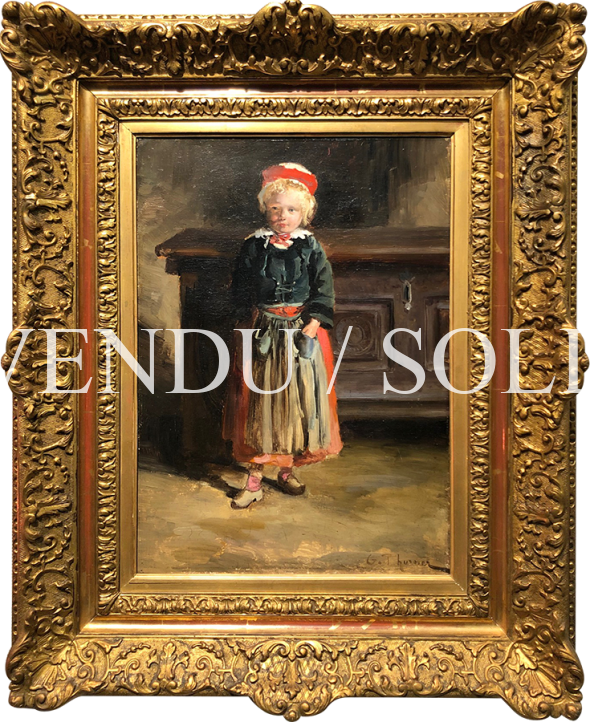 Gabriel Thurner expresses his talent as a portraitist in our child painting, succeeding in transmitting the grâce of this young girl to us. The irruption of the light in this interior scene, reinforced with the darker furniture background, contaminates the skin tone with white and glowing colorations. This child portrait animates itself with a balanced contrast between her lighted face, her colorful clothing and the rustic and somber decor. To density the shadows to let the light burst and spread, here the subtile effect of the artist in this charming painting.