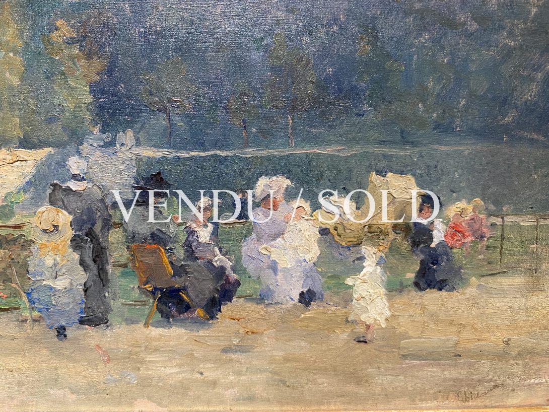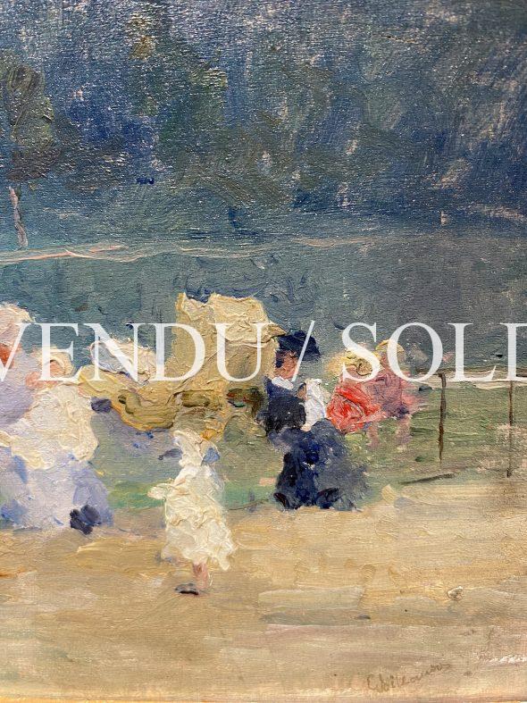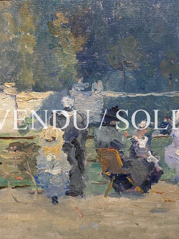 Les tâches de couleurs vivent dans ce petit tableau et sont très caractéristiques des œuvres de Billaudot, la touche est vigoureuse, le jeu des ombres et des lumières très naturel. Les formes des personnages se font incertaines, comme se dissolvant dans l’atmosphère. On reconnait ici des chapeaux et des robes dans des tons lumineux, dans une composition astucieusement cintrée par la balustrade du parc. Le peintre Billaudot joue volontairement sur les couleurs et les matières, et ses personnages se détachent sur un fond vert, dans de douces tonalités de blancs et de bleu, dans une ambiance délicieuse.