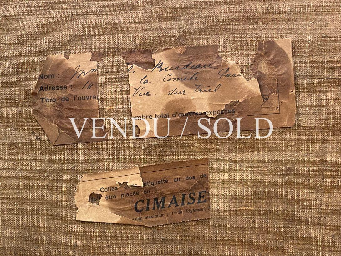 Étiquette d’exposition au dos, titre de l’œuvre, étiquette d’artiste