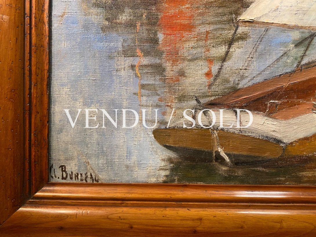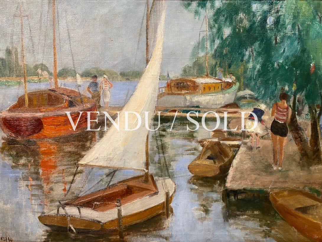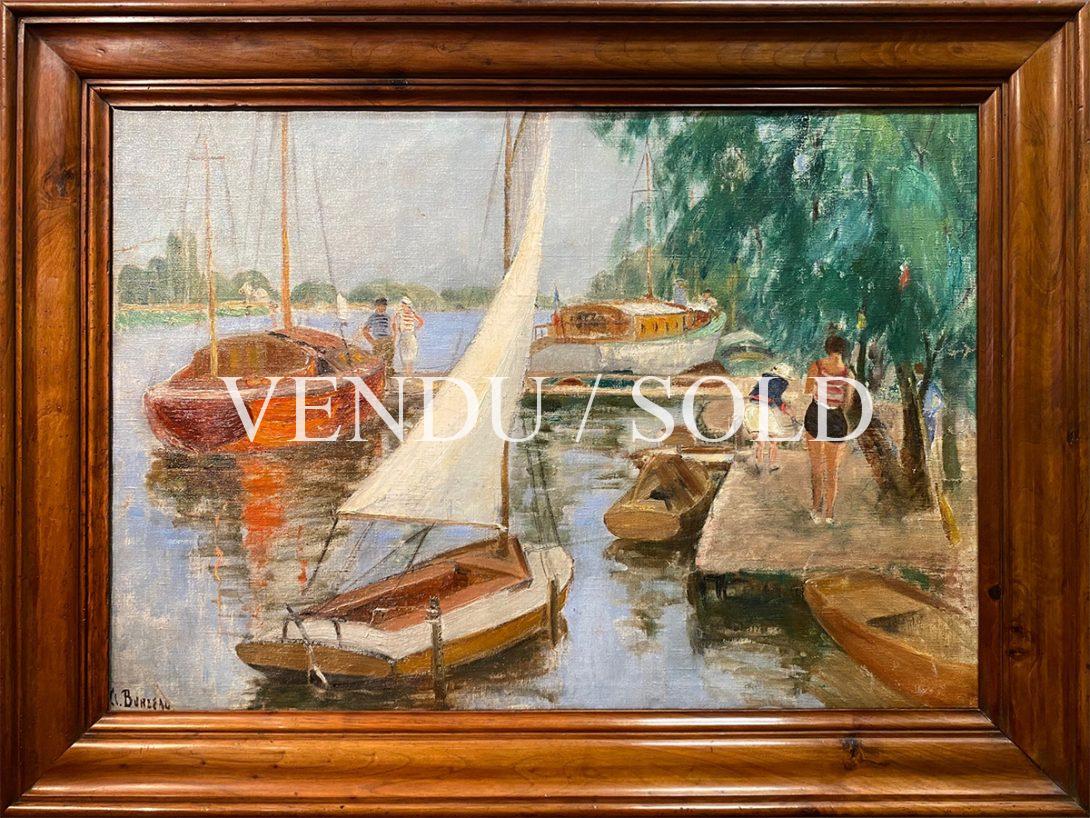 Clémence Burdeau nous présente ici un sujet qui lui est cher et où elle aimait souvent poser son chevalet: le petit port de Triel-sur-Seine, situé à une quarantaine de kilomètres de Paris entre la capitale et la Normandie. Ce lieu bucolique qui réunissait nombre de régatiers dans l’entre deux-guerres, est ici mis en lumière dans l’insouciance d’une belle journée d’été. Les quelques personnages qui s’activent autour de voiliers et autres bateaux appontés, réchauffés de couleurs rouges et orangées, participent à ce moment d’allégresse. De larges aplats de couleur marron soulignent les coques des embarcations alors que des touches furtives de bleu rendent à l’eau sa surface étincelante et ses reflets de lumière, excellant à rendre la fluidité et la vie mouvante de cette œuvre post-impressionniste.