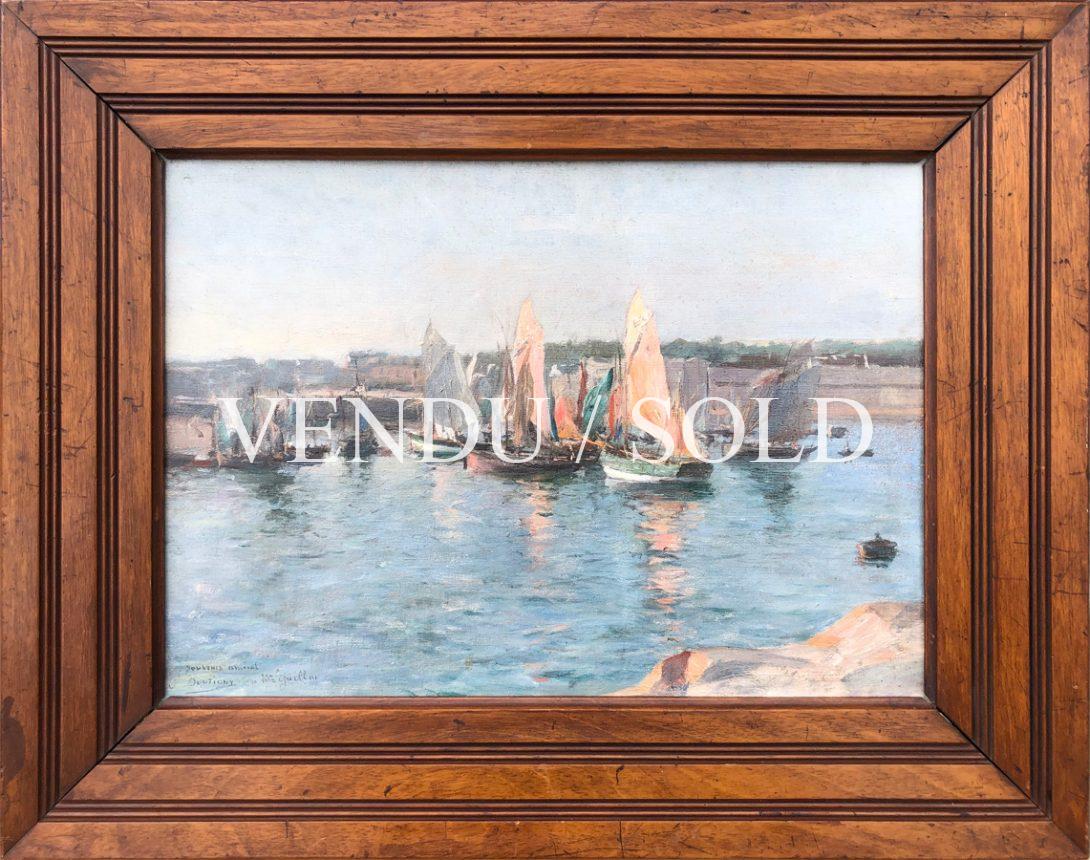 Ses scènes militaires ont souvent un caractère grandiloquent, mais ici, c’est une toute autre œuvre que nous livre le peintre. Fut-ce une halte en Bretagne, où l’artiste posa son chevalet sur un rocher, devant le port et les remparts de Concarneau. Aidé d’une technique quelque peu plus impressionniste que celle figurative utilisée pour ses sujets militaires, l’observation n’en est pas moins soutenue pour décrire une vue du port où croisent quelques jolis voiliers revenant de la pêche. Les aplats de matières s’agrègent sur les coques des navires, tandis que la palette de couleurs des voiles varie du gris pâle à l’oranger clair, passant par les verts, les bleus et les rouges. Le traitement de la mer est heureux, le peintre faisant onduler son pinceau pour ses effets de vague. Au loin distingue t-on l’architecture de la vieille cité bretonne, compactée de bâtiments, de murs et de pierre. Très juste observation du peintre, dans le feu de l’activité d’une flotte au retour de la pêche.