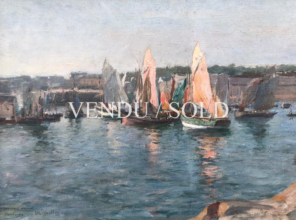 Ses scènes militaires ont souvent un caractère grandiloquent, mais ici, c’est une toute autre œuvre que nous livre le peintre. Fut-ce une halte en Bretagne, où l’artiste posa son chevalet sur un rocher, devant le port et les remparts de Concarneau. Aidé d’une technique quelque peu plus impressionniste que celle figurative utilisée pour ses sujets militaires, l’observation n’en est pas moins soutenue pour décrire une vue du port où croisent quelques jolis voiliers revenant de la pêche. Les aplats de matières s’agrègent sur les coques des navires, tandis que la palette de couleurs des voiles varie du gris pâle à l’oranger clair, passant par les verts, les bleus et les rouges. Le traitement de la mer est heureux, le peintre faisant onduler son pinceau pour ses effets de vague. Au loin distingue t-on l’architecture de la vieille cité bretonne, compactée de bâtiments, de murs et de pierre. Très juste observation du peintre, dans le feu de l’activité d’une flotte au retour de la pêche.