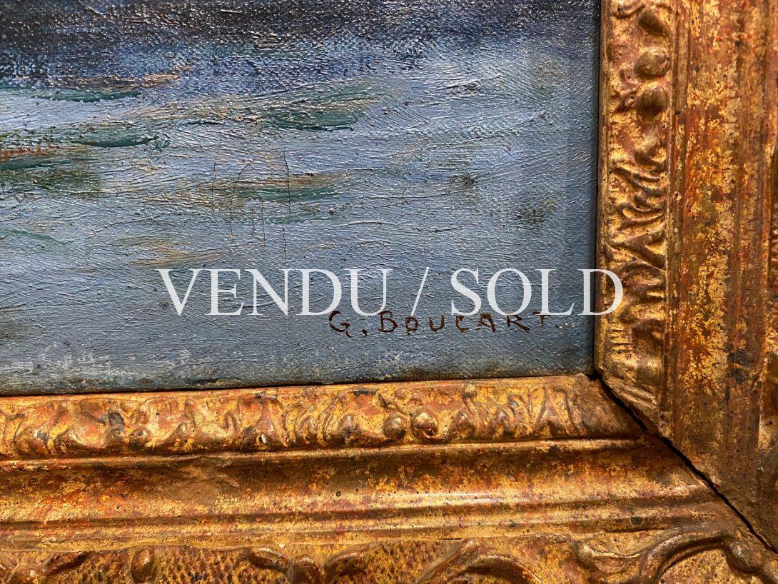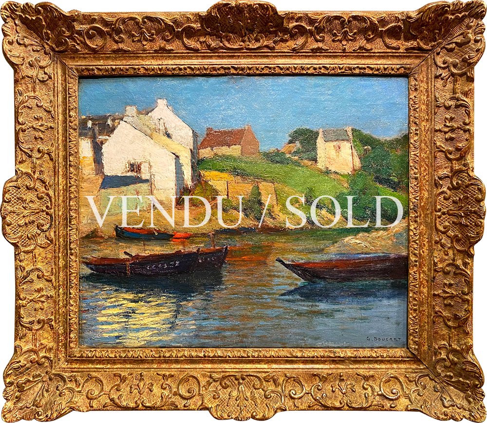 Here in our painting is the small harbor of Doëlan in Brittany, in an harmonious vibration of green, white and blue tones. The artist translates a joyful summer atmosphere by insisting on a strong contrast between the white dry color of the fishing cottages, the blue sky and the green landscape falling into the sea, simply observed from the other tranquil bank of the harbor. The scarlet effect of the water is given with impressionist touches of paint, yellows underlining blues, shimmering and playing an essential role in the painting. Boucart convinces us with the fugitive however beautiful reality of this marine landscape, a transient vision quickly transformed by the always changing aspect of the tide, the shadow and the light in Brittany atmospheres.