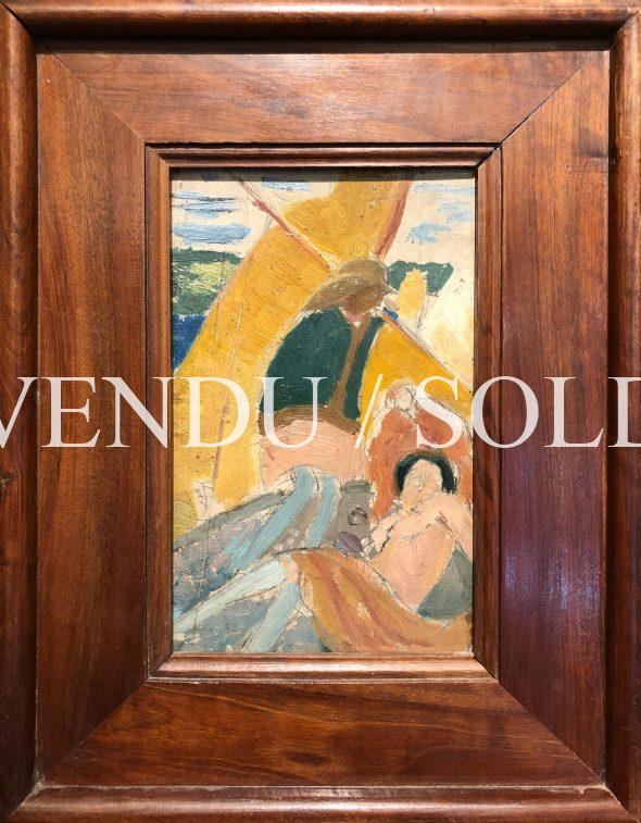 Il traita aussi des thèmes plus familiers, comme la composition heureuse et colorée de notre tableau Le voilier. Des nus et baigneuses, des paysages de Bretagne qui révèlent une sensibilité très proche du mouvement nabi et symboliste et l’esthétique nouvelle des années 30. Dans notre tableau se reflètent des aplats de couleurs vibrantes et une belle liberté d’exécution.