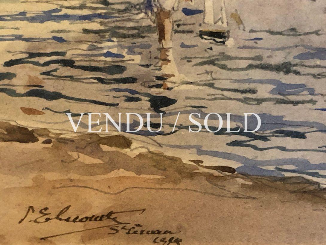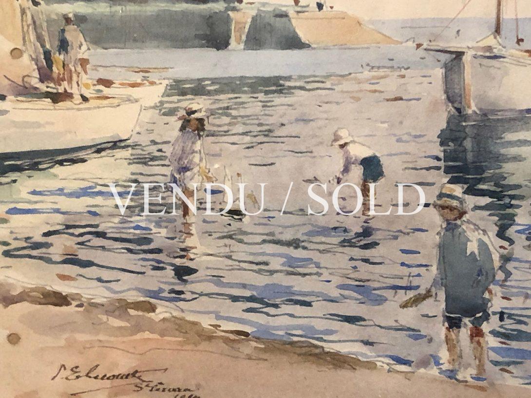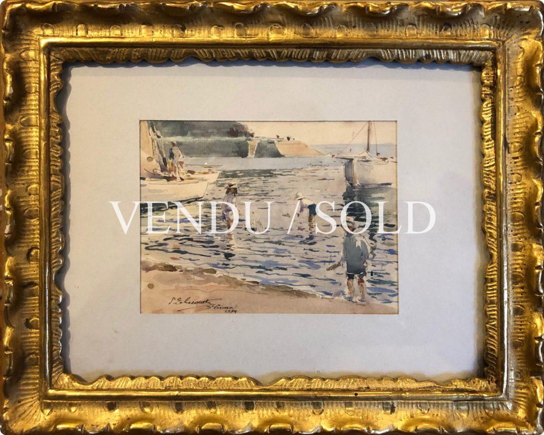 Paul Emile Lecomte fut un peintre voyageur infatigable, visitant sans relâche la Normandie, la Bretagne et la côte Atlantique, La Rochelle et l’île d’Yeu, tous ces lieux de bord de mer qu’il chérissait tant. De ses haltes artistiques, on retient dans ses huiles et aquarelles un grand choix de marines et de scènes de plage, comme cette délicieuse aquarelle peinte dans l’entre-deux-guerres sur la plage de Solidor à Saint-Servan où il posait souvent son chevalet sur la côte d’Emeraude, à Dinard et à Saint-Malo. Guidée par des touches légères, cette scène attendrissante témoigne de la sérénité du moment, où de jeunes enfants semblent imiter leurs aînés navigateurs et s’adonnent aux premiers joies de la plaisance.