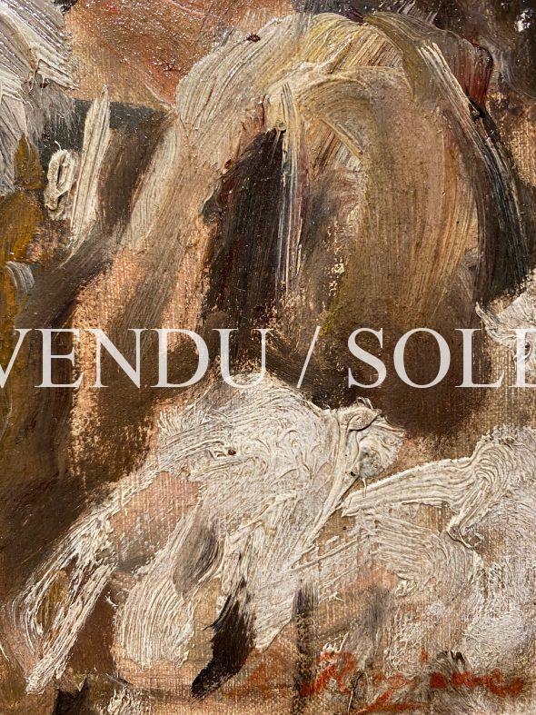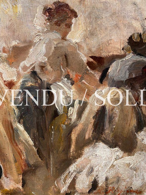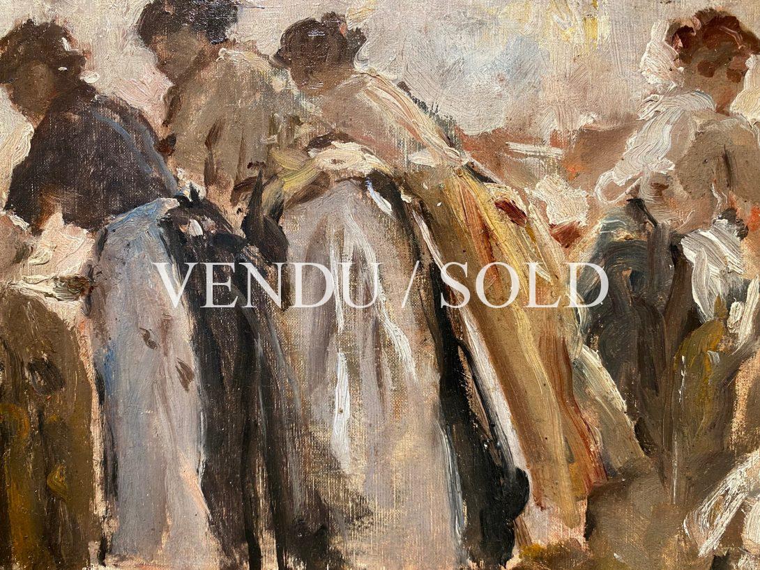 Les lavandières, Raffael RAGIONE (Naples, 1851- 1925)Huile sur toile marouflée sur carton, signée en bas à droite Dimensions sans cadre 53×22 cmDimensions avec cadre 56×42 cmInstinctif et original, Ragione fut formé à l’Académie des Beaux-arts de Naples, et fut l’élève de Domenico Morelli et Stanislao Lista. Dans ses premières œuvres, il se distingua dans les portraits et les scènes de genre et se montra sensible aux effets de lumière. Il entra en contact avec la Scuola di Resina qui rassemblait un groupe de peintres napolitains qui peignaient d’après nature et capturaient de petites scènes de la vie quotidienne dans l’environnement bourgeois que Ragione a disposées sur la toile avec des couleurs fraîches, aériennes et délicates, rendues en petites et grandes tâches.Il fut présent aux expositions Promotrice de Gènes en 1874 et 1875, exposa à Milan en 1874 et 1895, à Turin en 1875 et 1878 et à Rome en 1893.Après s’être établi à Paris en 1902, il adopta un style  plus frais, plus doux, plus spontané et plus proche des impressionnistes. Il resta dans la capitale jusqu’en 1923, date à laquelle il retourna à Naples.La Galeriede l’Académie des Beaux-Arts de Naples possède l’huile sur toile Communicanda.Le parc Monceau fut un des ses endroits de prédilection où il aima peindre des élégantes de la Belle Époque, des nurses et des enfants, les unes tricotant, les autres jouant. Ce parc parisien fut sa toile de fond d’une grande partie de sa production, sans oublier ses multiples pérégrinations artistiques dans Paris (l’Arc de Triomphe, etc).C’est une toute autre scène qui nous est offerte ici, très originale: des lavandières ou blanchisseuses toutes occupées à leur tâche, dans un intime ballet de gestes et de mouvements rendus par de larges aplats de pinceau. Les plis des robes captent la lumière auréolant aussi les visages, et le peintre traduit la lumière sur les robes en grandes touches allusives, riches de matière. Le fond clair du tableau irradie ces femmes, et les jaunes, les gris et les blancs du fond font éclater une lumière souveraine, bien au-delà d’une banale représentation. L’ondulation du pinceau, à la manière des impressionnistes italiens de l’époque, ose dissoudre les formes humaines dans une interprétation rapide et très personnelle.