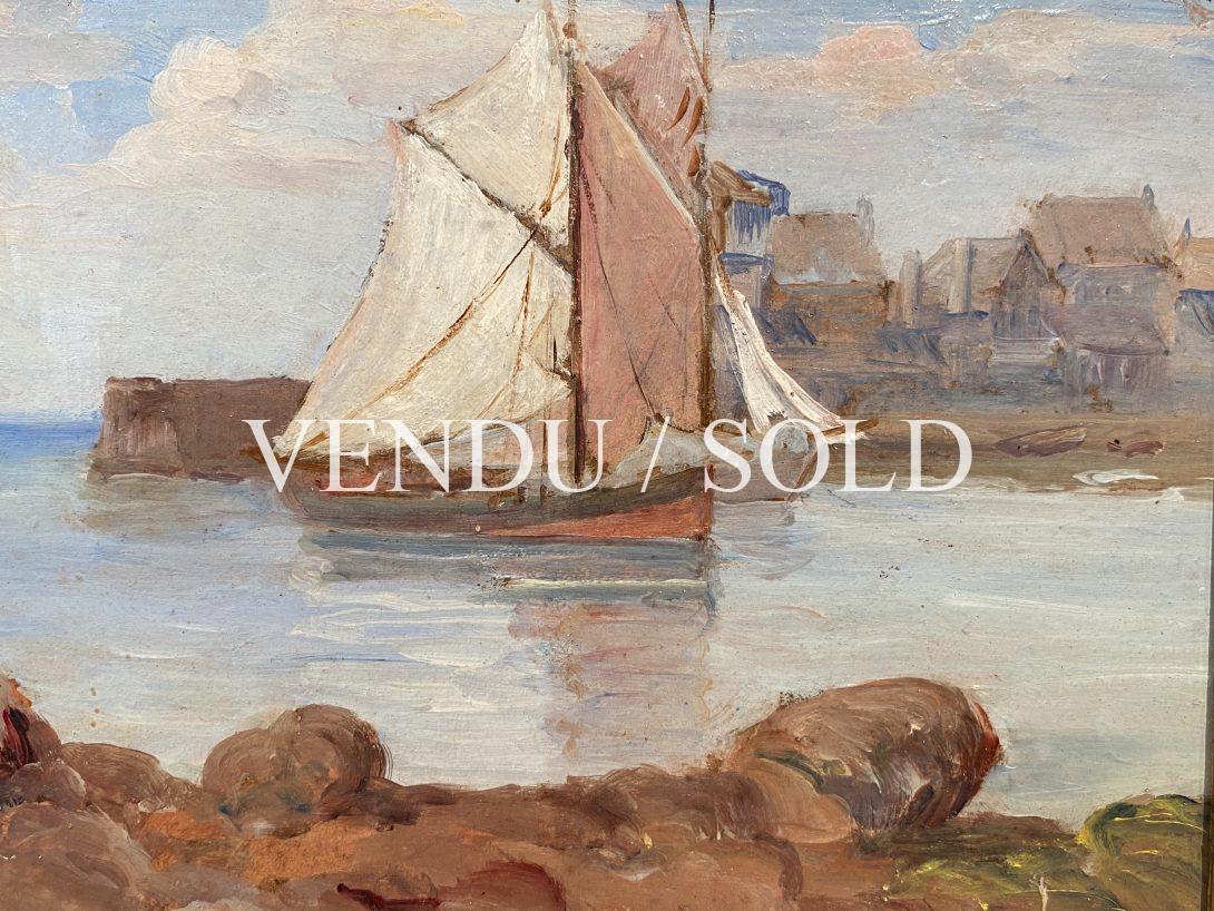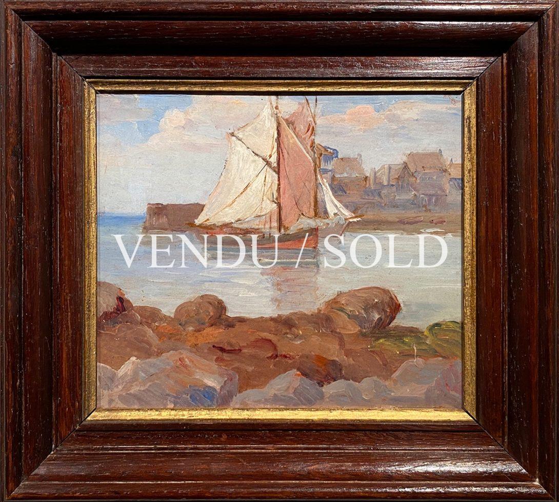 Son thème préféré est la mer (réf. Schurr, dictionnaire des petites maîtres de la peinture), à l’image de notre tableau évoquant la navigation paisible d’un voilier rentrant toutes voiles dehors sur la côte bretonne. La formation nuageuse et le calme de la mer sont joliment rendus, la vive couleur rouge de la coque tranchant avec la légèreté presque aquarellée de la terre et du ciel, se mêlant l’une à l’autre, alors que le rose pâle de la voile contraste avec les eaux bleues de l’estuaire.