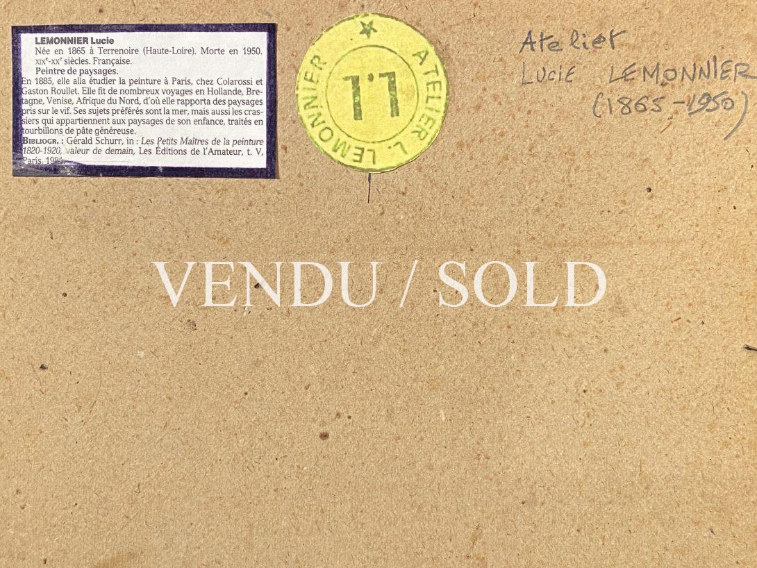 Lucie Lemonnier vient à vingt ans étudier la peinture chez Colarossi et surtout Gaston Roullet; il lui transmet la technique de transparences et de glacis de son maître Jules Noël et lui apprend la rigueur du graphisme. Ses premières toiles se caractérisent par des camaïeux de verts très tendres ou de bleu turquoise.