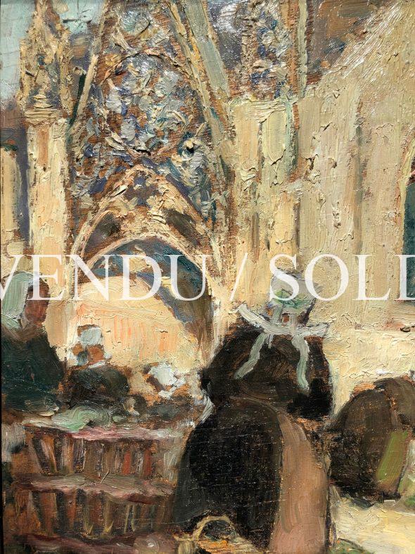 Our painting was executed during a market day in front of the Notre-Dame-de-Roscudon church, a beautiful Gothic church which architecture dates back to the 13th century. In a joyful maniere, the contrast between the architecture, the stained glass painted with colorful dots of brush strokes, and the lovely ladies dressed in black, all these creates a whirlpool of warm tones in the painting. Under the lighted facade of the church, the artist gives a large part of his work to the dancing silhouettes in the front scene, forms and touches being associated in a common harmony.