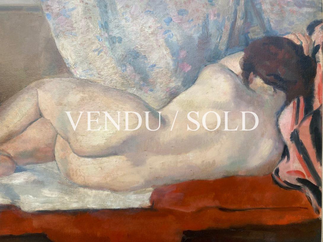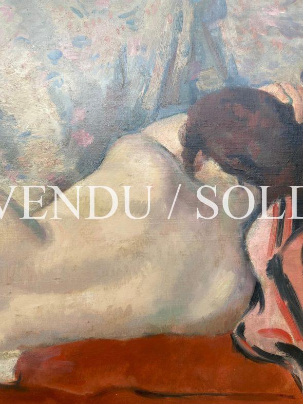 D’une touche puissante et sa matière onctueuse, ce nu intimiste nous emmène dans le juste répertoire du peintre où il excellait à peindre ce genre de sujet. En cadrant fortement sa composition, Charles Kvapil influe sur la qualité de la lumière pour orienter notre interprétation, utilisant des blancs écarlates. Les motifs de tissus entourent ce corps féminin dénudé et l’enveloppent dans une douce et jolie lumière. Riche en couleur fauve avec ce rouge posé comme un socle statuaire, le sujet du tableau montre l’influence de Manet et Courbet chez notre peintre. Ici, à l’atelier, la sensation éprouvée encore présente aujourd’hui, il joue des transparences des fonds à l’aide de glacis subtils, ajoute de très légers empâtements, pour laisser apparaître ce corps, dont le geste maintenu du bras au-dessus du visage vient poétiquement ponctuer la grâce du modèle.