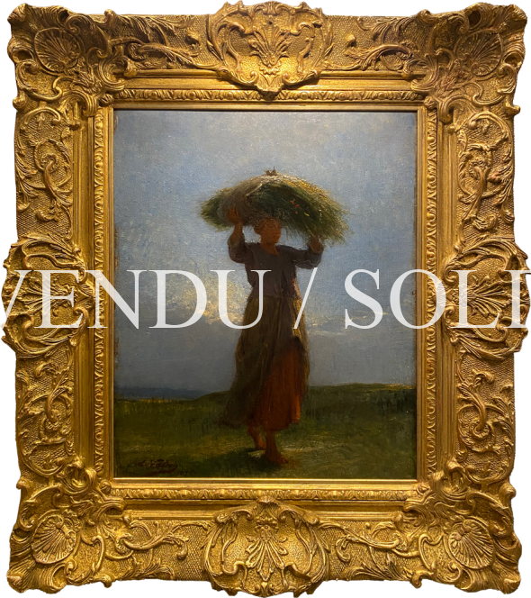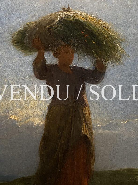 Ici, la coloration chaude d’une belle soirée d’été au soleil couchant, où de généreuses gerbes reflètent les derniers rayons du soleil, illumine le dos du personnage. Le peintre paysagiste nous convie à travers la campagne dans l’intimité de ce contre-jour. L’après-midi touche à sa fin, le soleil vient à peine de se dissimuler derrière la crête des nuages, et le labeur vu à travers un solide académisme nous rappelle la poésie des tableaux de la plaine de Barbizon très appréciés dans cette deuxième moitié du dix-neuvième siècle, où l’attrait du plein air et des scènes de la vie quotidienne valurent à ces artistes bon nombre de commande dans les Salons officiels.