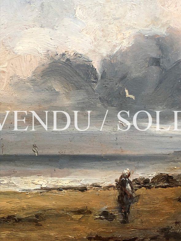 A tempestuous, windy and grey sky are still living in our scene, and this small oil board all in contrast, expresses very well the Brittany coast atmosphere, with the imprecision of forms and the opposition between lights and shades. Seagulls flying in the horizon, and a sail in a far distance justify the spontaneity of the artist observation. The accuracy of the brush and the clarity of tones of colors unite together to create a light that irradiates the scene in the boldest way and diffuse all the way to the fishing lady and the rocks on the beach.