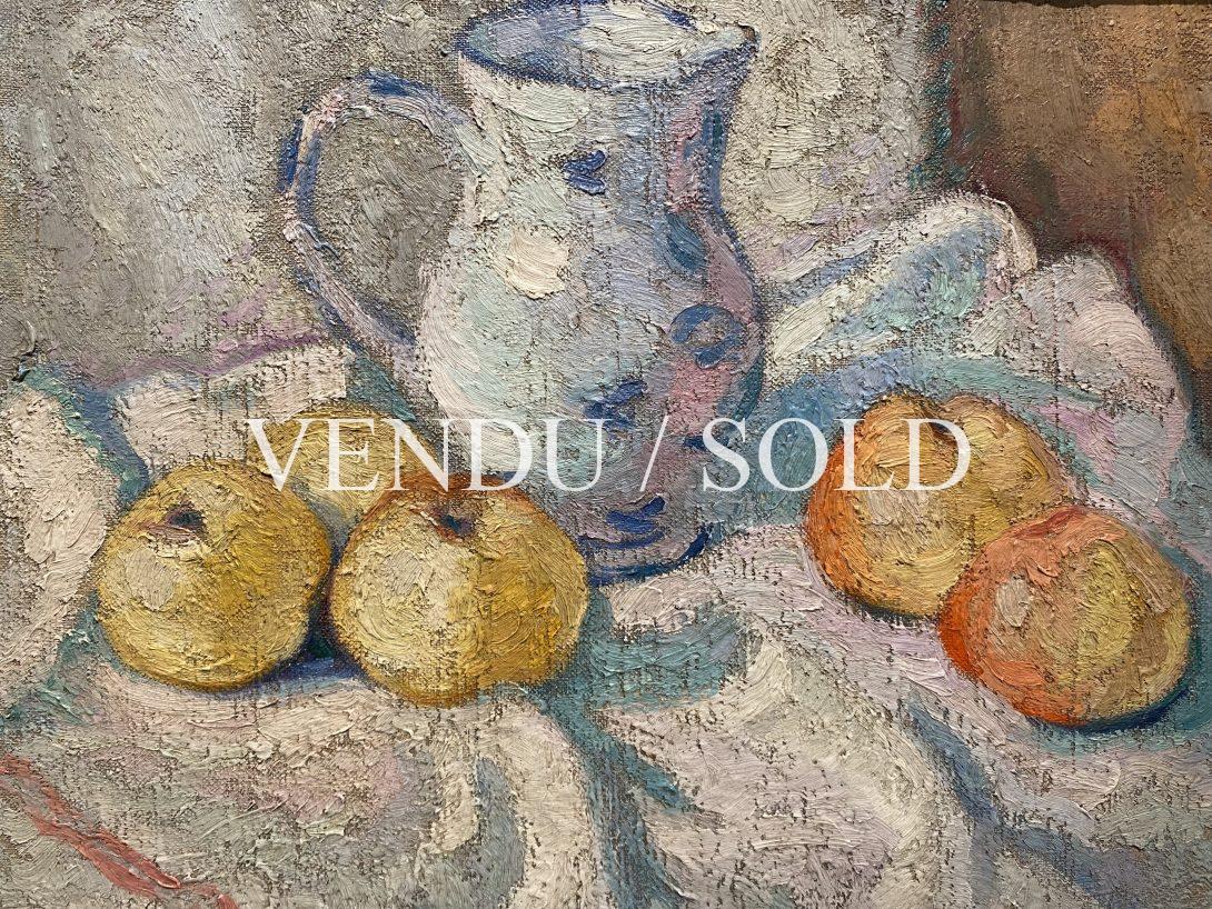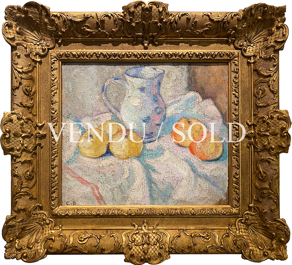 Undoubtedly, our painting reunites all this. A palette of vivid colors, all the way to some pink strokes on the surface of the pitcher, witness the vitality and curiosity of the artist. « Volume, light and colors » was his motto and his way to explore his artistic fields through Cézanne, the fauvisme and cubism as well.