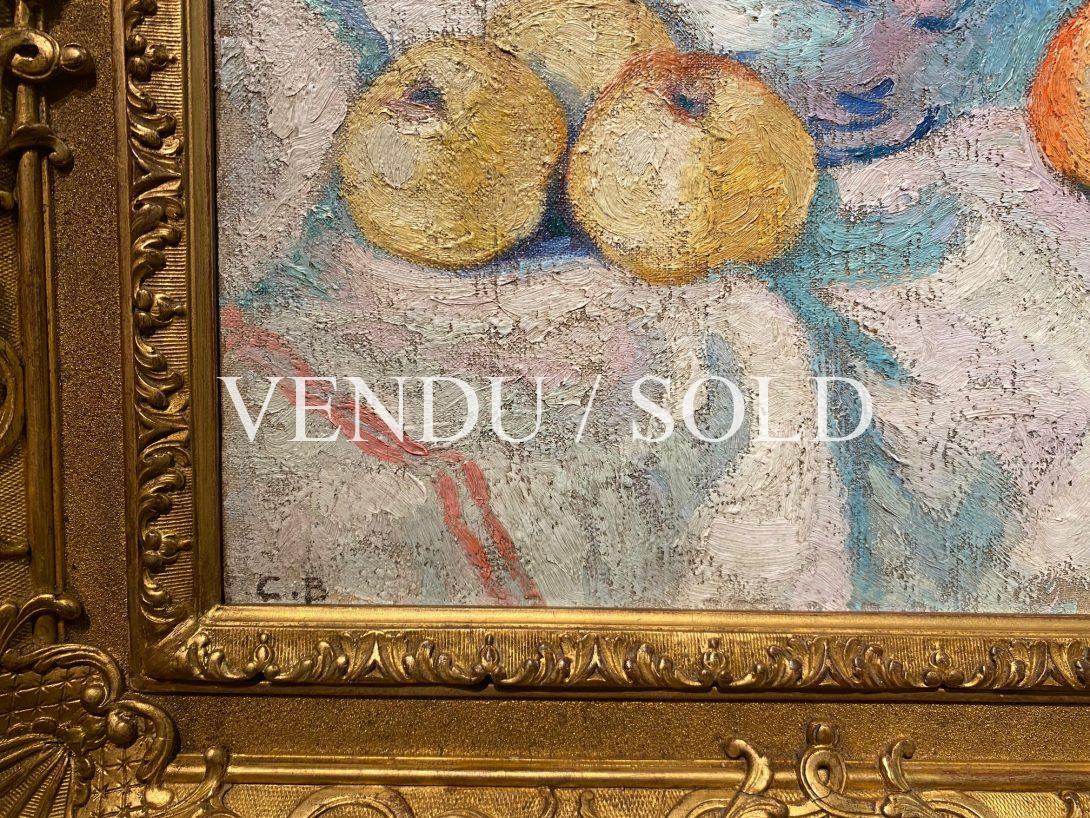 In 1903, influenced by the impressionnistes nourishing the famous donation Caillebotte, Bichet turned his style, cleared up his palette, opened wide his technique, giving up with academic rules. In 1906 and 1907, after committing his own autodafé by burning more than three hundred artworks from his production in one night, Bichet went back to work and started an impressionist série of paintings with apples subjects, still lives, using a fauve technique with bright colors and powerful contrasts, that he showed after 1907 at the galerie Dalpayrat in Limoges.Our painting dates 1921, fifteen years after his artist friend Leon Jouhaud described in a book the destruction of his production and the renewal of his inspiration. Bichet reused his canvases for other works, recycling old works from this disruptive period. Like our painting, some other artworks from Bichet showing at the museum of the Beaux-Arts in Limoges witness this period: painted on both sides of the canvas, inspired with an other subject. Similar to his production and his habit to recycle painted canvases, our painting also represents in the back another still life with apples and lemons.