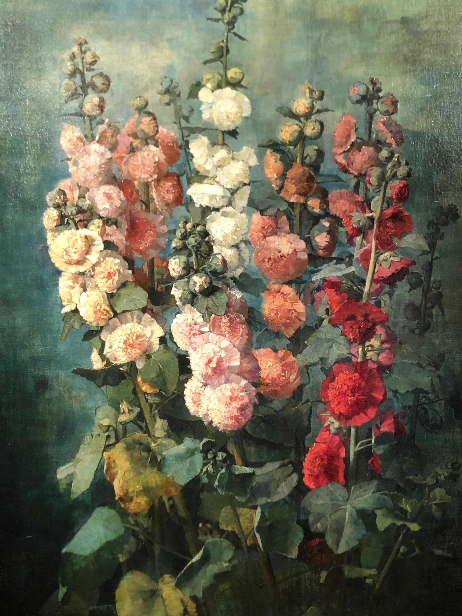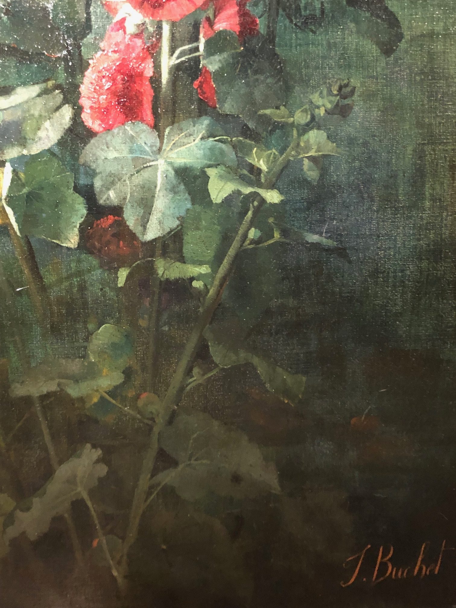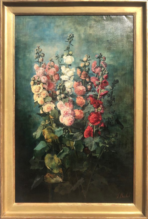 Our painting was acquired directly from the family of the artist and has been conserved in the family house in the Cher region all these years after Julie passed. Our floral composition of hollyhocks is sincere, from flower buds to blooming roses, keeping away from the academic series of floral paintings. Julie Buchet gracefully observed the pastoral effect more than the academic trend of that period, when flowers had a specific decor. Here, no effect, no portraiture: fresh green leaves, some burnished, a palette of red and white tones and colors, while the flowers are solidly composed. Julie Buchet succeeded at this large scale painting: she renounced to any artifice, nor special effects. Stems, inflorescence, insertion of petals and flowers observed from various angles, Buchet triumphed from all obstacle with such brio: the life of each rose during different steps of its life finds in our artist a faithful lover for nature.