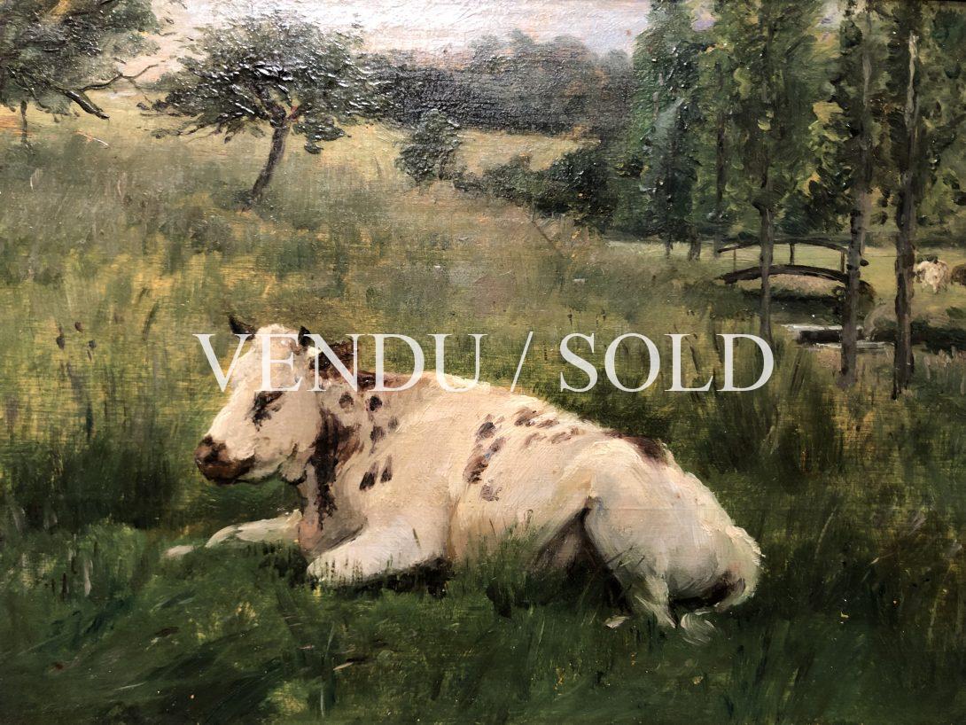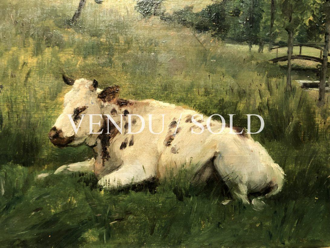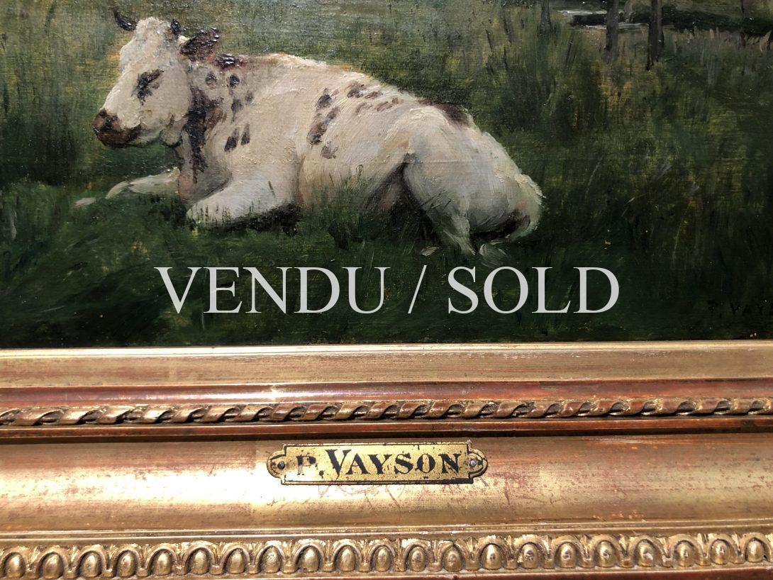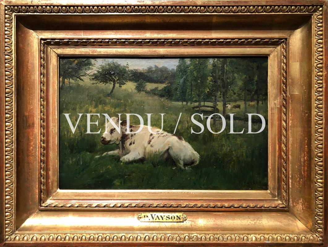 Vache dans un pré, Paul VAYSON ( Gordes, 1842-Paris, 1911)Huile sur panneau, signé en bas à droiteDimensions sans cadre 27×17 cmDimensions avec cadre 40×31 cmÉlève de Charles Gleyre et Jean Laurens, Paul Vayson débuta à Paris au salon de 1865 et fut sociétaire des artistes Français à partir de 1883. Il remporta une médaille d’or à l’Exposition Universelle de 1889 et à celle de 1900. Chevalier de la Légion d’honneur en 1886, il devint officier en 1906. Il bénéficia d’une exposition personnelle réunissant une centaine de ses toiles à la galerie Georges Petit en 1907. Il participa aussi à la décoration du buffet de la Gare de Lyon en exécutant un vaste triptyque de 9 mètres de long sur la ville de Hyères. Ami de Frédéric Mistral, il a poursuivi une carrière politique qui l’a porté à la mairie d’Avignon.Ses scènes champêtres, de gardeuses de moutons, de foires aux bestiaux l’emmenèrent jusqu’aux cimaises des musées: le Louvre (jeune gardienne de moutons, 1907), Nantes (le Berger et la mer), musée Calvet en Avignon, musées de Carpentras, Montpellier, Carcassonne, Bordeaux, Nîmes, Orléans, Marseille (la Bergère endormie, 1876).Un monument est inauguré en son honneur, en 1913, au jardin du rocher des Doms en Avignon, en présence de Frédéric Mistral, cette œuvre du sculpteur Félix Charpentier le représente en buste avec une bergère et ses moutons.Notre charmant tableau est à l’image de l’œuvre de Paul Vayson, sensible dans la composition, la lumière et les tons de couleurs. Il illustre la France rurale, et campe son sujet dans une campagne charmante, où le pré ondoie entre les arbres et la rivière adossée d’un petit pont. Avec cette scène d’une ruralité paisible, Paul Vayson rencontrait alors un grand succès, une photo du peintre dans son atelier attestant d’une production foisonnante de charmants sujets champêtres qu’il aimait à exposer sur ses murs.Cow on a field, Paul VAYSON ( Gordes, 1842- Paris, 1911)Oil on board, signed bottom rightDimensions without frame 10×7 inchesDimensions with frame 16×12 inchesStudent of Charles Gleyre and Jean Laurens, Paul Vayson started to exhibit at the Salon in 1865 and was society member of the artists Français since 1883. He won a gold medal at the Exposition Universelle in 1889 and 1900. Chevalier de la légion d’Honneur in 1886, he became officer in 1906. He exhibited a hundred of his works at the galerie Georges Petit in 1907, and participated also at the decoration of the buffet of train station Gare de Lyon, with a nine meters triptych describing the Mediterranean city of Hyères. Friend of Frédéric Mistral, Paul Vayson also led a political carrer that took him to the city hall of Avignon.Pastoral scenes, goat shepherdess and farming scenes with cows, these lovely artworks took him to many museums walls: le Louvre ( young shepherdess keeping goats, 1907), Nantes (shepherd and the sea), museum Calvet in Avignon, museum Fabre in Montpellier, Orléans, Nîmes, Carpentras, Carcassonne, Marseille (sleeping shepherdess, 1876).A monument was inaugurated in his honor in 1913, in the rocher des Doms garden in Avignon, with Frédéric Mistral, representing the bust of Paul Vayson sculpted by Felix Charpentier, with a shepherdess and goats.Our charming painting witnesses of the art of Vayson, sensitive in the composition, the light and the tones of colors. As an illustration of rural France, a charming part of the country side, a hilly field ondulating between trees and river surmounted with a little bridge. Peaceful retreat as it looks, Paul Vayson represented such subjects in the Salons of his time, as witnesses the black and white photo of his atelier showing him surrounded with cows portraits and pastoral scenes which he aimed to place on his walls.