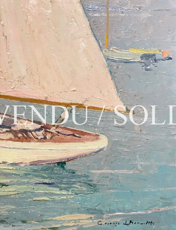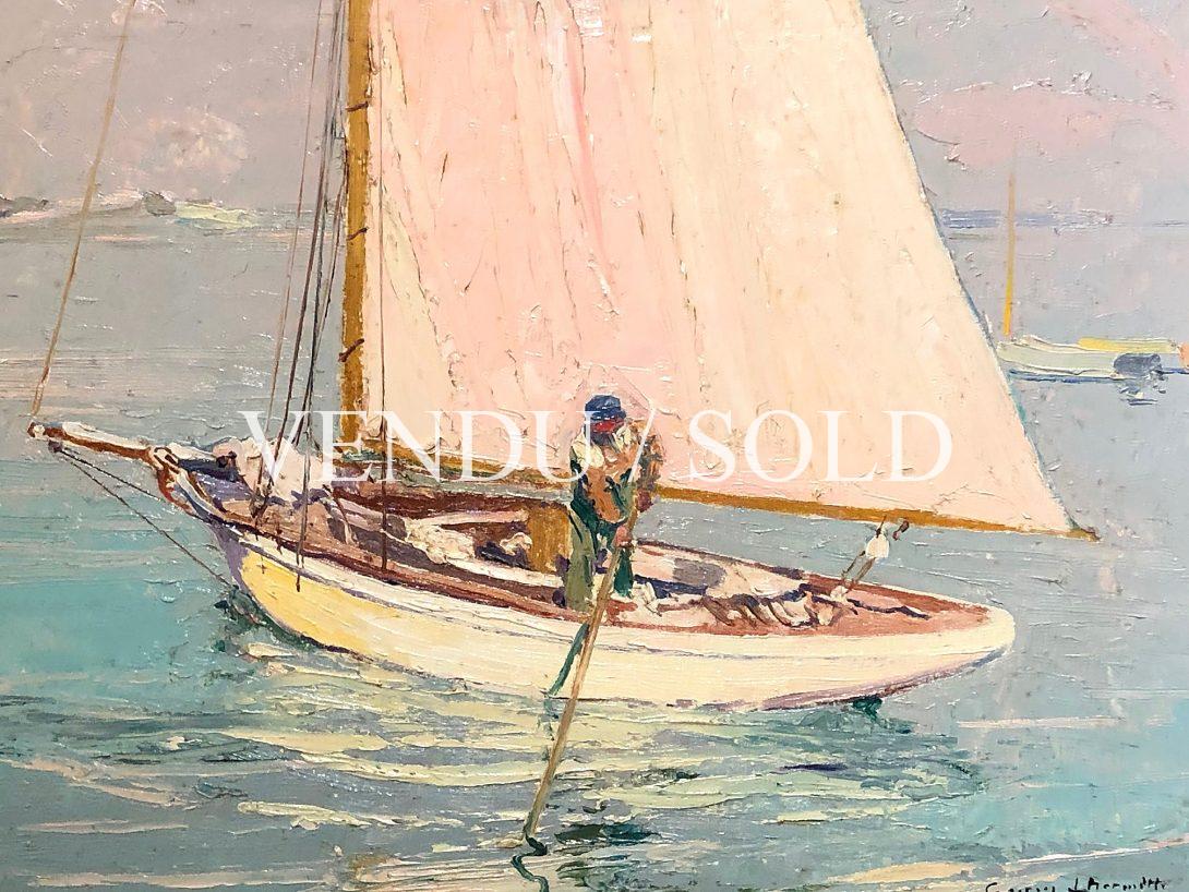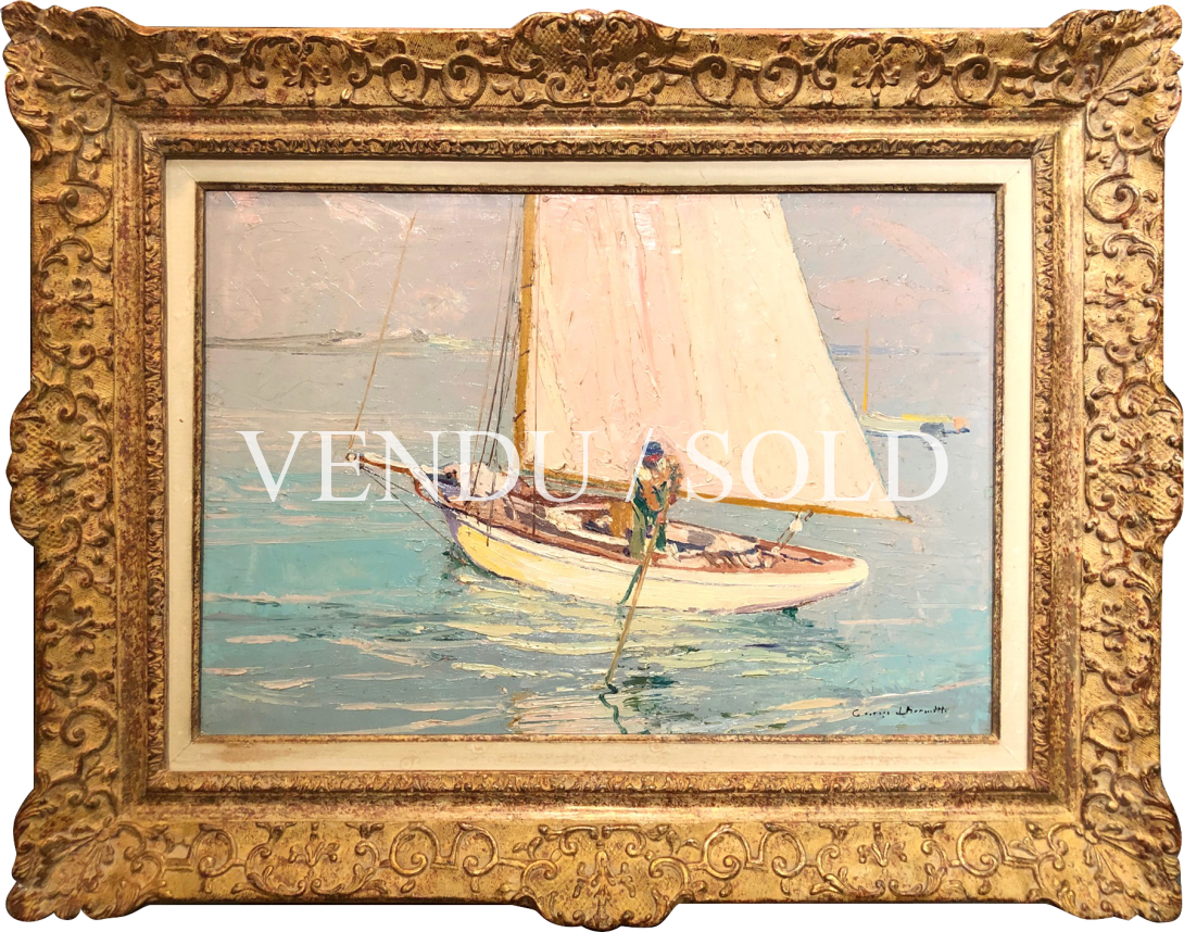 Georges Lhermitte was a marine painter who specialized in seascape scenes around Brittany, especially in the area of the Morbihan. There, he focused on boat portraits, and the sea life that came with it. Very nicely, our painting depicts a calm sailing day on the sea, underlined with thick brush strokes in a palette of light blues, greens and whites, softly creating a mood for a long lasting summer ambiance. Almost abstract in some areas of the artwork, for instance the small boat on the right side of the large one, the artist Lhermitte used a post-impressionist technique with an indéniable sincerity. In the back is the artwork located in Morbihan and we can date this work around 1930.